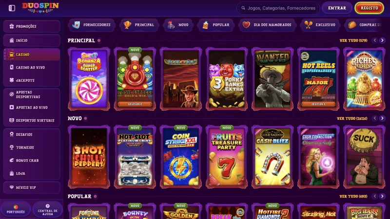 O nosso menu de jogos foi criado para navegação rápida e informação clara. No Duospin Casino, pode filtrar por categoria, fornecedor e funcionalidades, para que seja fácil encontrar jogos que combinem com o seu ritmo. A maioria dos tÃtulos de slots no nosso site mostra um RTP médio em torno de 96%, e cada página de jogo apresenta regras, linhas de pagamento e detalhes essenciais antes de jogar. Se é novo, também pode começar em modo demonstração, quando disponÃvel, e mudar para jogo a dinheiro real quando estiver pronto.