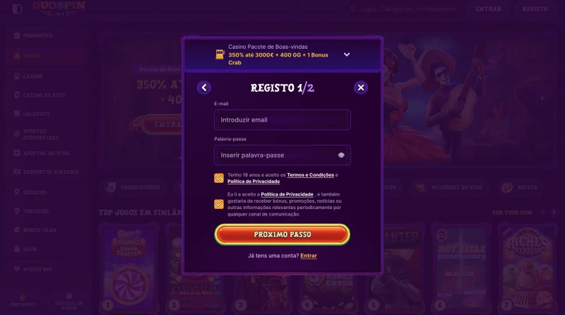 Promoções contÃnuas estão disponÃveis para jogo regular e são atualizadas ao longo da semana. No casino Duospin, também pode participar em torneios com prémios em moedas ou em EUR, dependendo do evento. Publicamos as regras do torneio, jogos elegÃveis e datas de término na página do torneio, para que saiba o que conta para a classificação. Se está à procura especificamente de um bónus sem depósito do casino Duospin, tenha em conta que não listamos uma oferta padrão sem depósito na página de promoções para Portugal; o nosso principal valor são ofertas com depósito e requisitos de aposta claros.